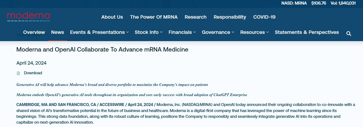Moderna partners with $MSFT OpenAI to advance mRNA with AI