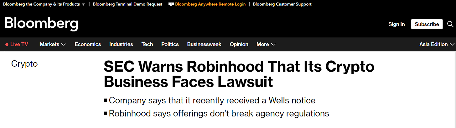 Crypto Market: SEC warns Robinhood Crypto of potential securities law violations