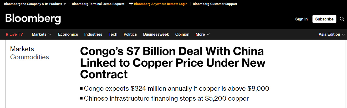 Congo to receive 324 million USD/year for infrastructure projects from Chinese partners until 2040 if copper price stays above 8,000 USD/ton.