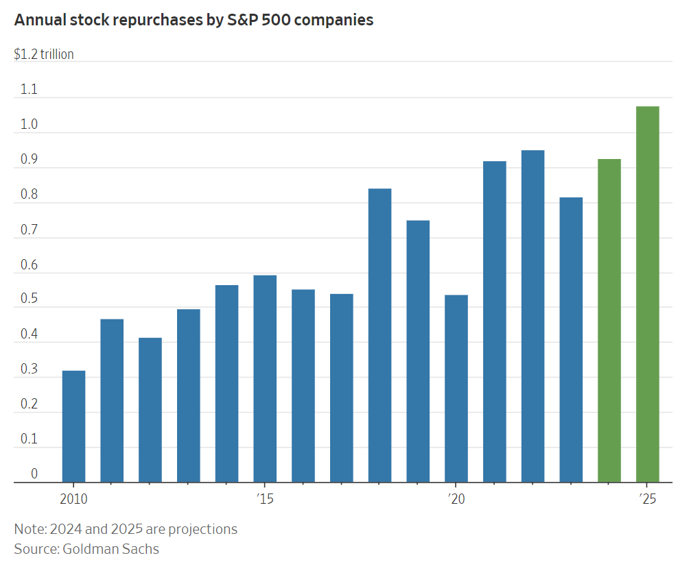 S&P 500 group expected total buybacks to reach 925 billion USD this year (+13% YoY) and 1.075 trillion USD in 2025 (+16% YoY).