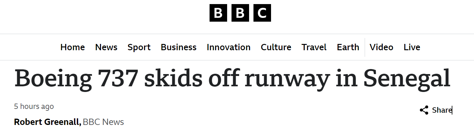 Boeing 737 skids off runway near Senegal's capital Dakar, 11 injured.