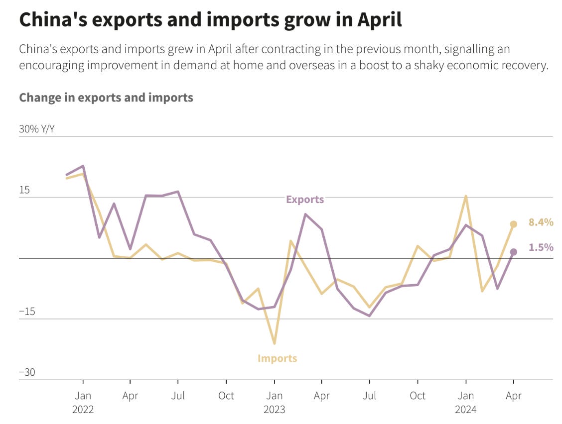 Import value also rises to +8.4% y/y - far exceeding forecast +4.8% y/y and March's -1.9% y/y decline.
