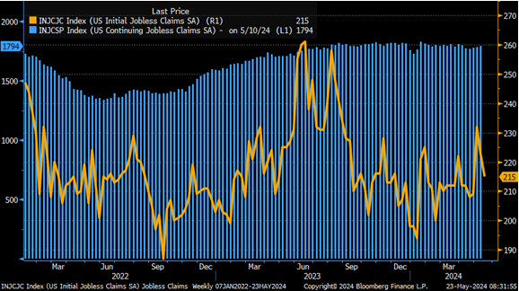 Initial jobless claims fell to 215,000 - largest drop since September (forecast: 220,000, previous: 223,000).