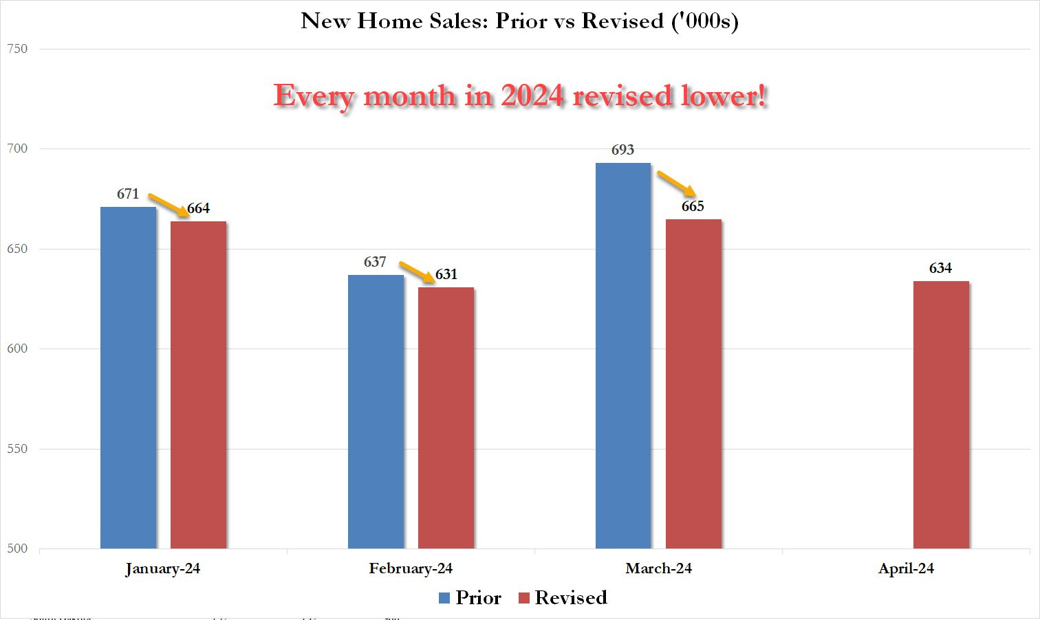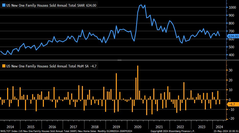 New home sales in April fell to 634,000, down -4.7% MoM (estimate -2.2% & previously +5.4%).