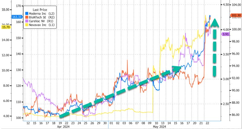 Surge in demand from vaccine stockpiles drives up stock prices of vaccine manufacturers: Moderna +14%, BioNTech +11%, CureVac +18%, Novavax +5.3%.