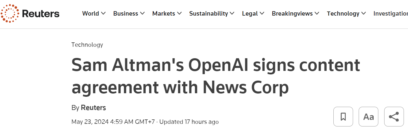 OpenAI signs agreement granting access to content from some of the largest news publications owned by News Corp media group, valued at 250 million USD.