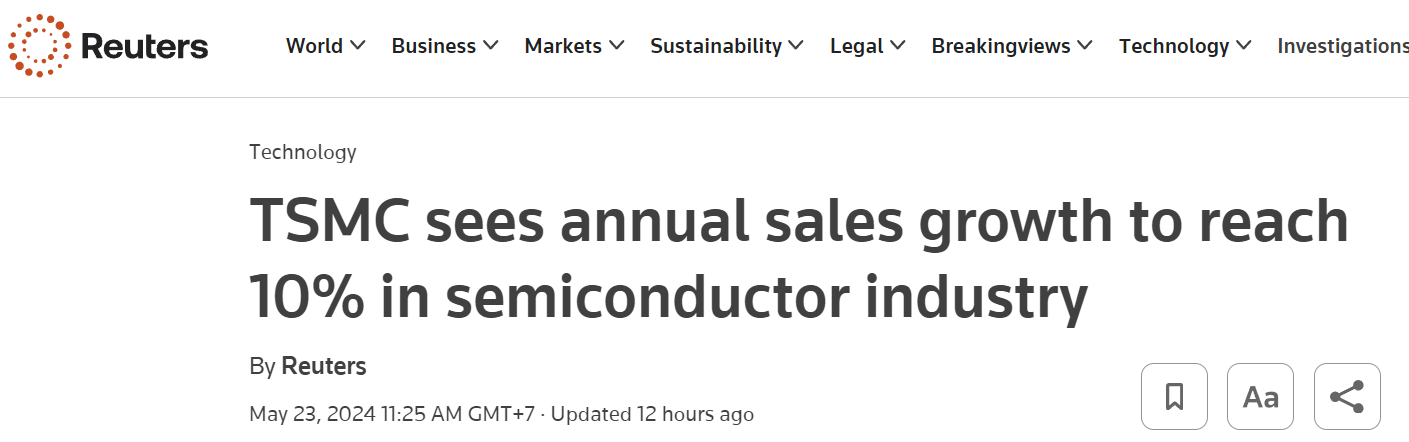 TSMC predicts global semiconductor industry annual revenue growth could reach 10%.