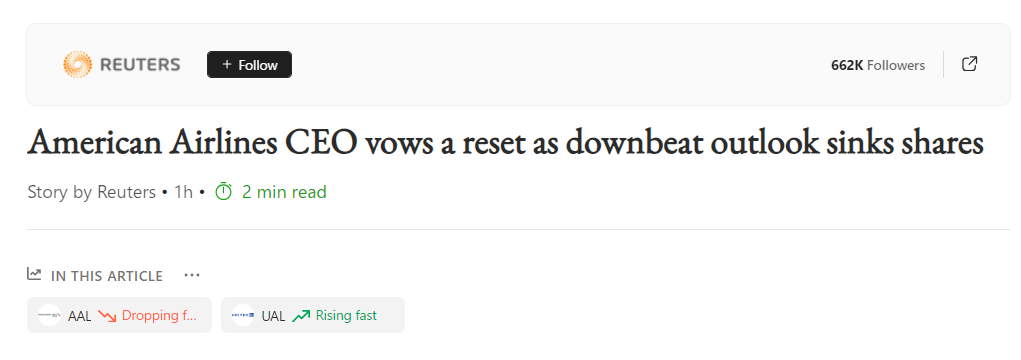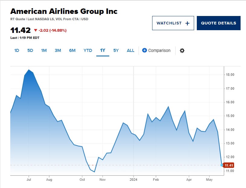 American Airlines stock falls -15% after announcing slower capacity growth in the second half and considering a series of changes in sales strategy