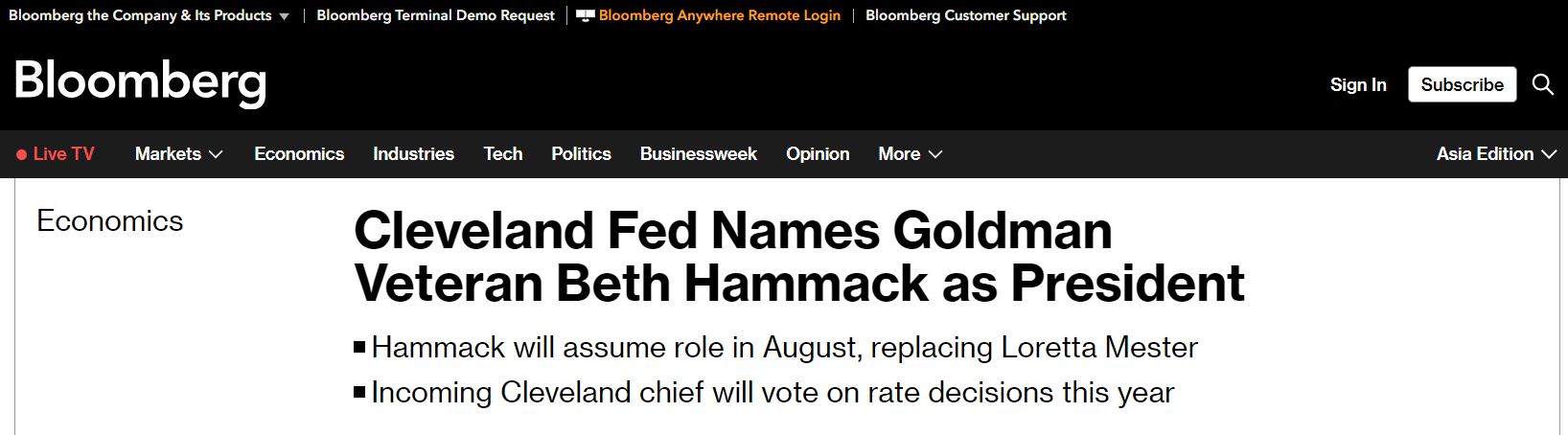 Beth Hammack, former Goldman Sachs employee, will be the next president of the Cleveland Fed, replacing Loretta Mester