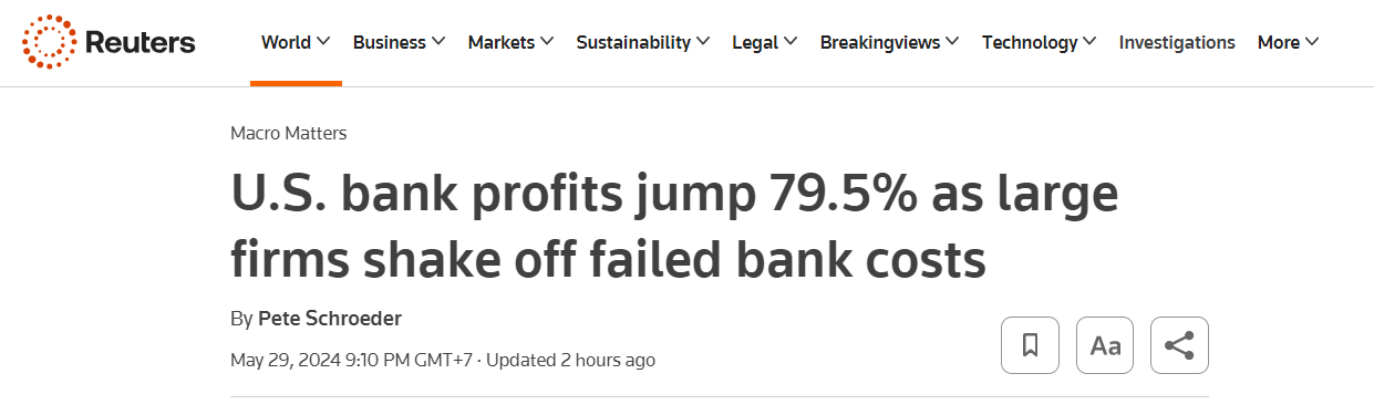 US banking sector earnings also increased 79.5% to 64.2 billion USD in Q1/2024.