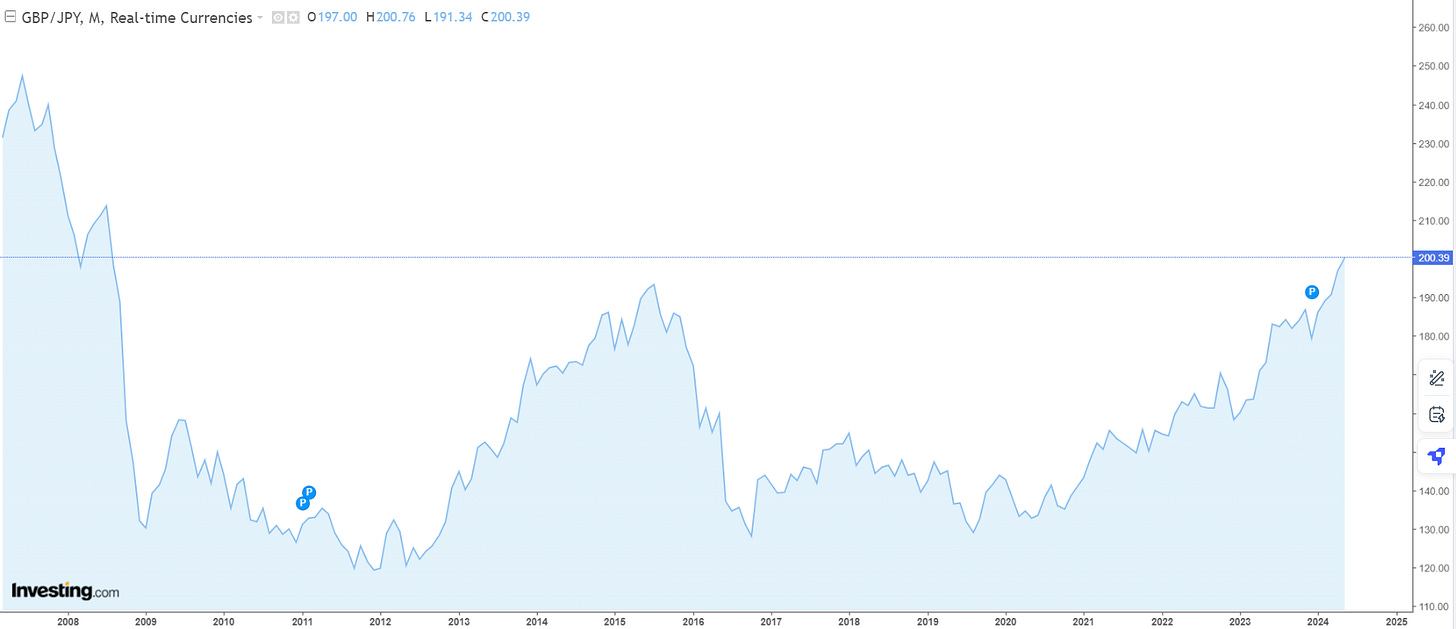Japanese Yen weakens sharply as GBP/JPY rises 0.1% to 200.63, highest since August 2008.