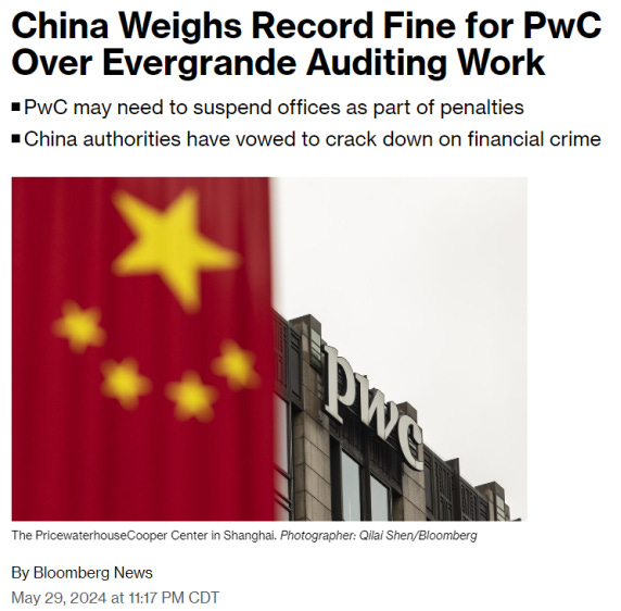 China may impose the largest fine in history on PwC (~ at least 138 million USD) for failing to detect the largest financial fraud in history at Evergrande