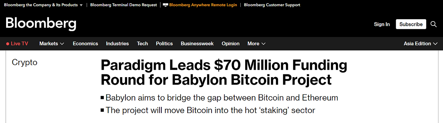 Babylon, Bitcoin staking solution incubated since 2022, successfully raises additional $70M in latest round led by Paradigm.