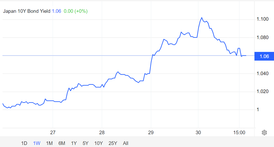 Japan's 10-year JGB yield hits 1.1% in the session - the highest since July 2011 as investors expect more tightening from the BOJ