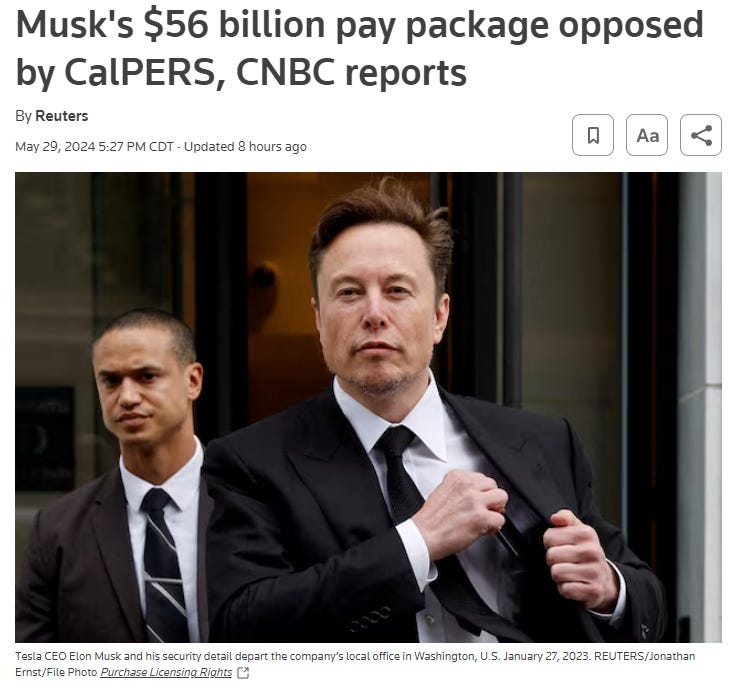 CalPERS, the nation's largest public pension fund, is voting against a 56 billion USD compensation package for Elon Musk