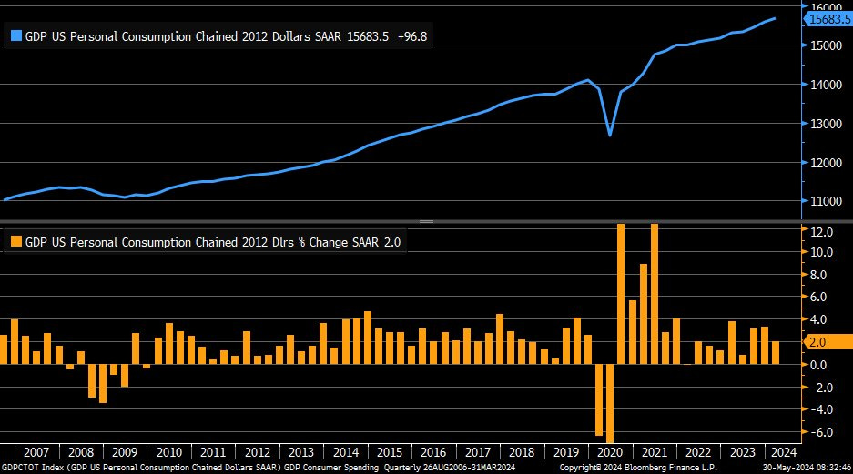 Q1 Personal consumption revised down from +2.5% Q/Q to +2% (below expectations of +2.2% Q/Q)