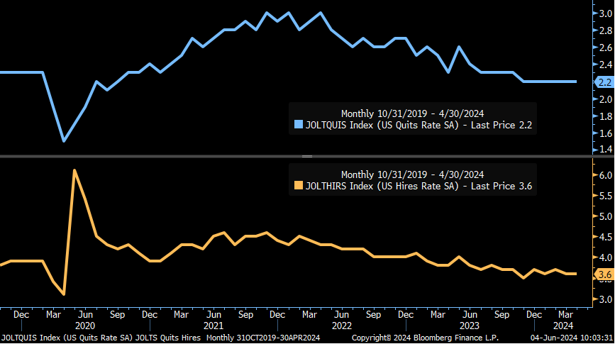 Quit rate stable at 2.2% for 6 months while hiring rate continues to trend down → Labor market still rebalancing