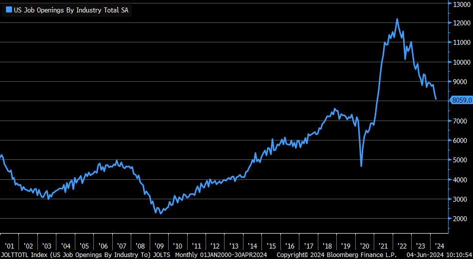 April job openings drop to 8.06 million - lowest since Feb/2021, below estimate of 8.35 million and previous 8.36 million