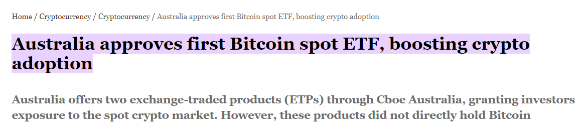 Australia has the first spot Bitcoin ETF that directly holds BTC