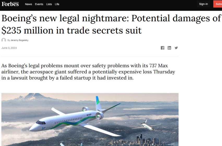 Boeing faces trade secret lawsuit with potential damages up to 235 million USD.