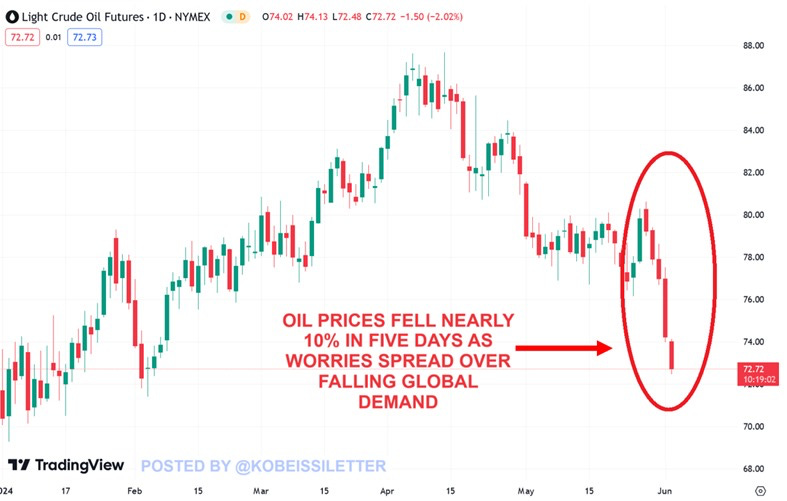 Oil prices down nearly 10% in 5 days, nearing 2024 low on concerns of weakening global demand.