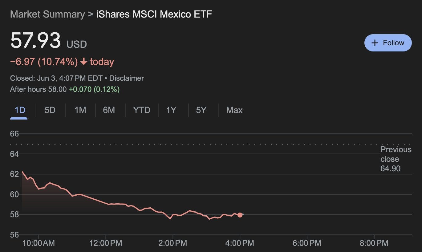 Mexico's stock market ETF drops 11% after Mexico's stock market experiences the worst day since 2008.