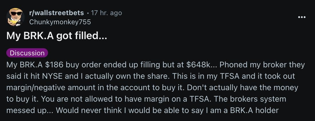 1 investor tried to buy and order executed after glitch fixed, they paid 648,000 USD for the stock, all in margin
