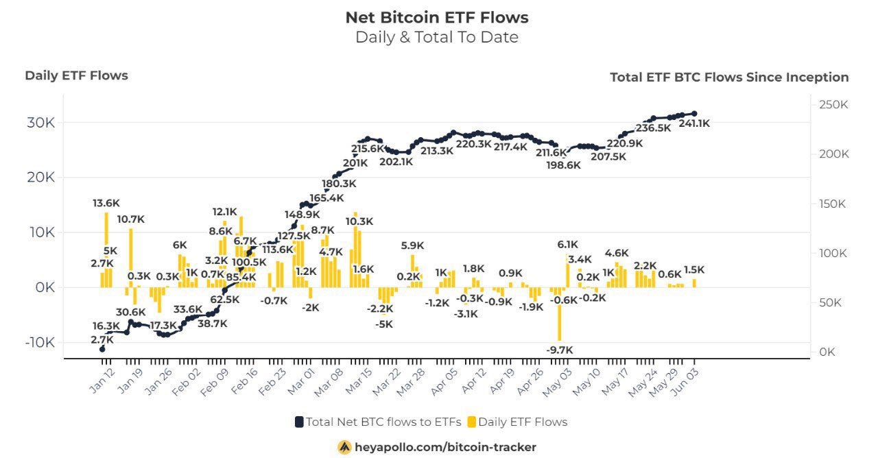 Bitcoin ETF funds see inflows equivalent to 1521 BTC today - the 15th day of BTC ETF inflows.