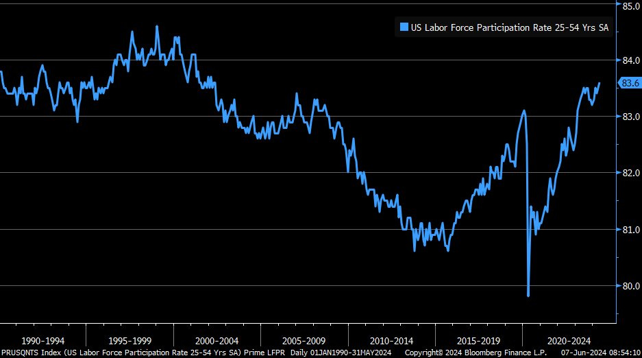 Labor force participation rate for prime-age (25-54 years old) at highest since May 2022.