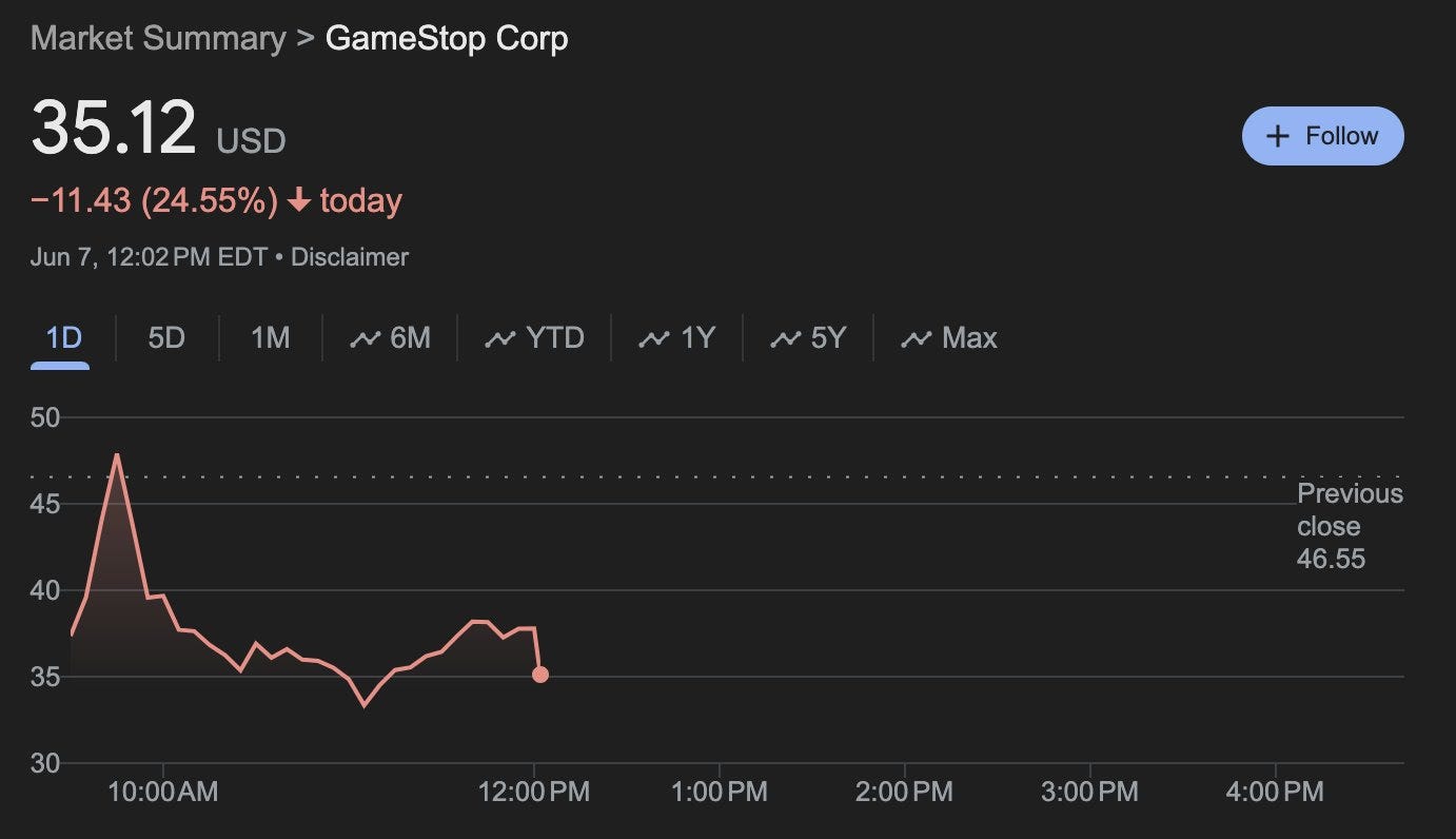 Previously GME surged +40%, then dropped -25% in just the past 6h, equivalent to market cap change of about ~$15 billion.