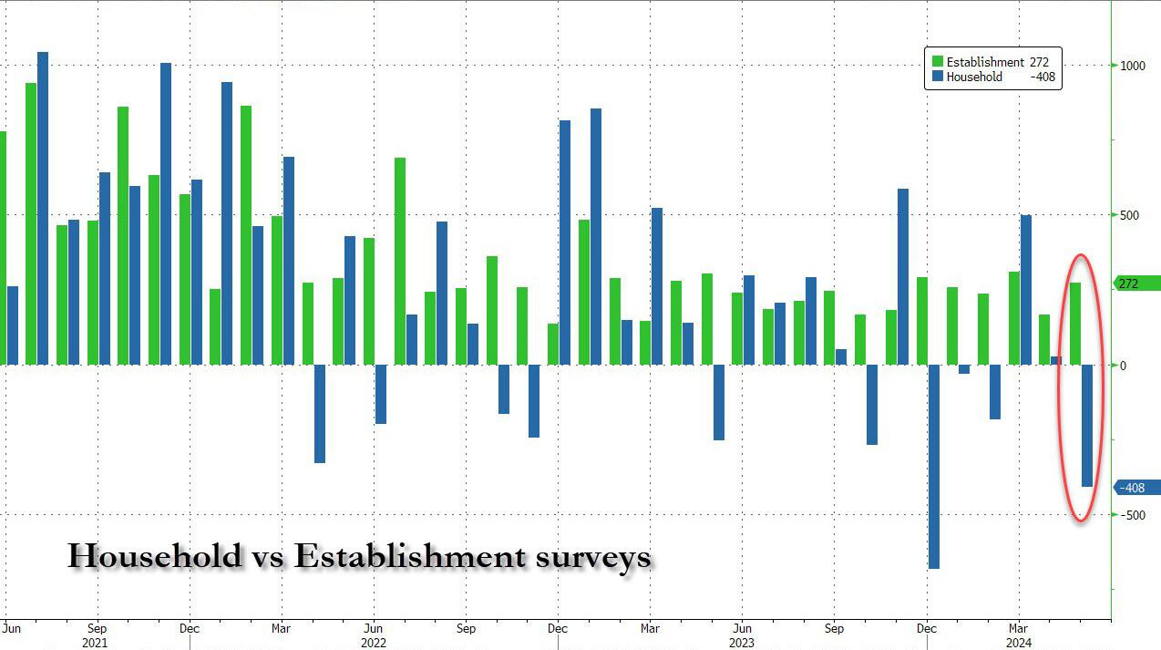 US added 272,000 jobs in May, nearly double the expected and previous month's figures. However, unemployment rate rose, labor force participation fell, and household survey shows US LOST 408 thousand jobs instead of adding. Why is that?