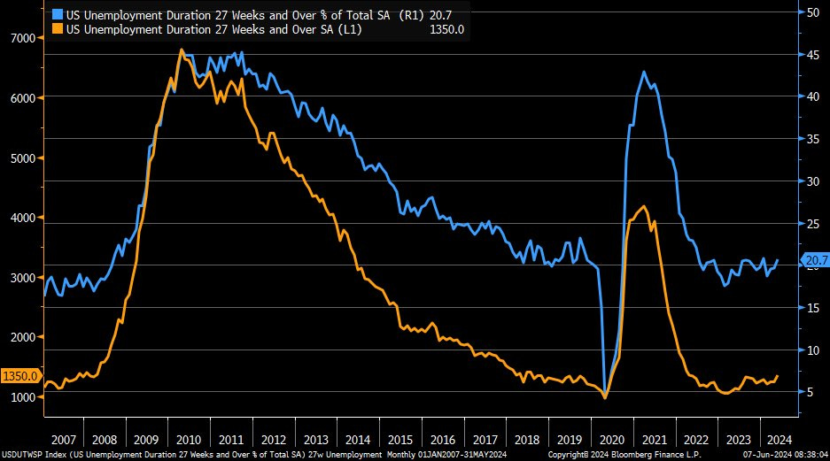 Long-term unemployment rate (> 27 weeks) edges up to 20.7%.