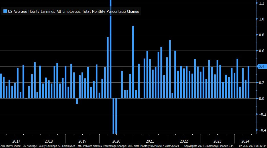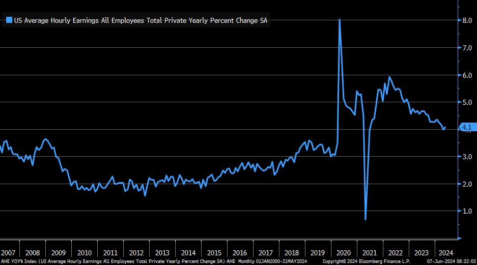 Average hourly earnings in May edge up to +4.1% YoY (previous 4%, expected 3.9).