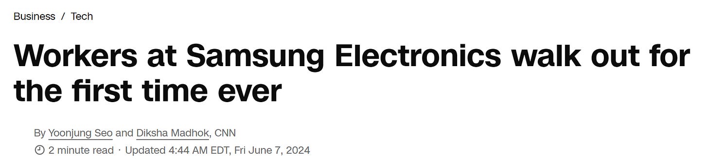 Nearly 30,000 Samsung employees go on strike for the first time in history due to labor dispute.