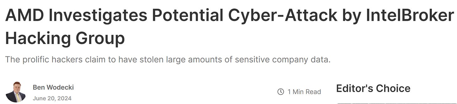 Hacker group IntelBroker is selling stolen internal data from AMD on BreachForums —incident from yesterday— AMD is continuing to investigate.