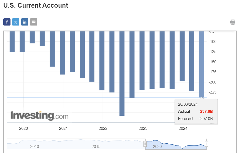 US Q1 current account balance deficit -237.6 billion USD, higher than expected — but this data did not cause much market volatility.