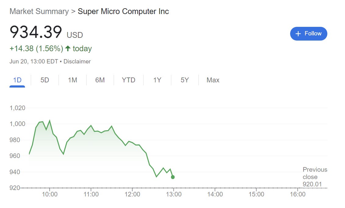 Super Micro Compute and Nvidia up more than 4% in overnight trading (though pulled back in today's session).