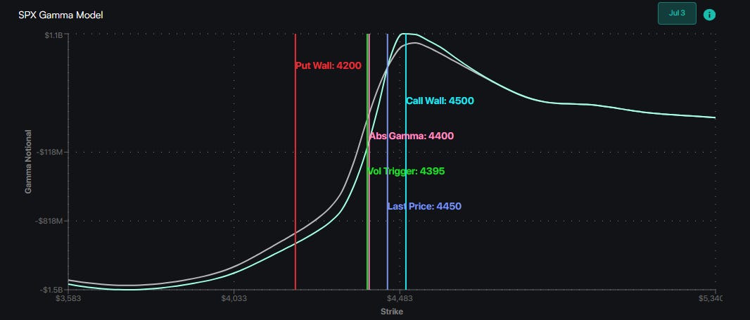 Moving to today, with most of the market standing aside from trading, low liquidity environment is quite understandable. With SPX call wall moved up to 4500 after last week's OpEx, 4400 level gamma flip will be the “risk-off” signal for SPX.