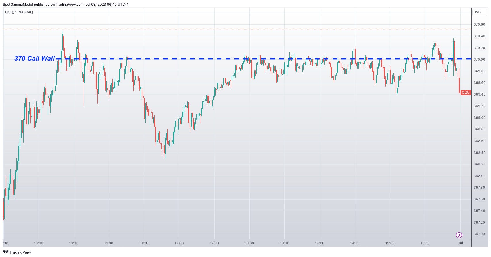 Market continues melt-up in the last trading session of the first half of 2023 with SPY +1.18% and QQQ +1.54%. VIX pushed to bottom below 13 before spiking at the end of the session, closing the day in green, pulling the entire equities block along before the closing bell, clearly showing most traders not confident holding positions over 3.5-day weekend holiday. SPX breakout from call wall at level 4400 right from the start of the day and closed at quite neutral level ~4450 while QQQ rejected at call wall 370.