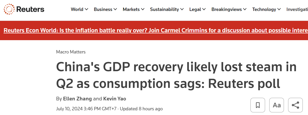 China's GDP likely to slow: only at 5.1% in Q2 (slowing from the first 3 months) due to weakening consumption.