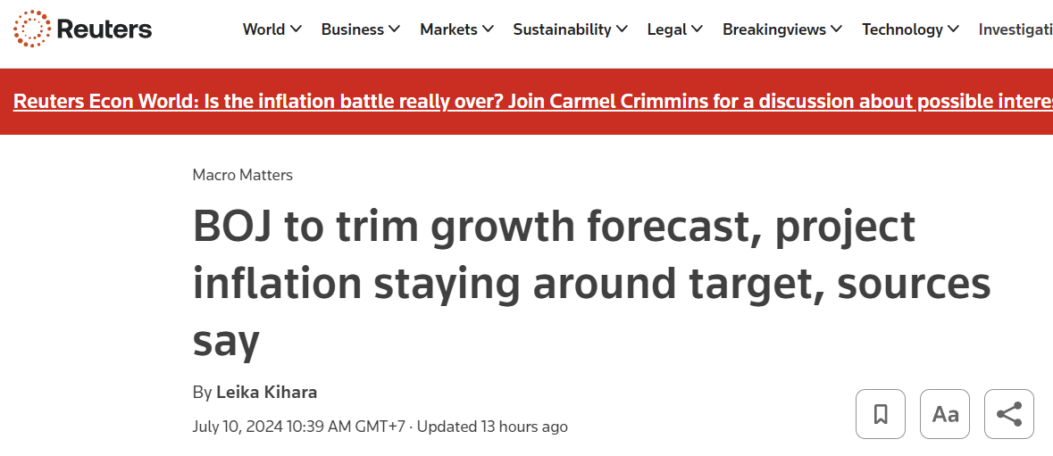 Bank of Japan (BOJ) cuts growth forecast for this year, forecasts inflation to remain around the 2% target in coming years.