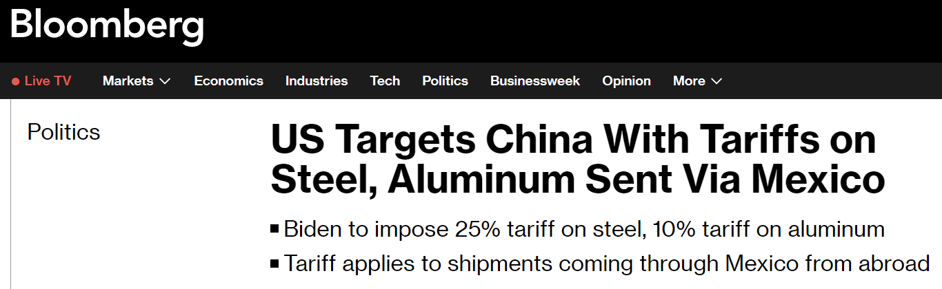 US imposes 25% tariff on steel and 10% on aluminum transshipped through Mexico from other countries, mainly China.