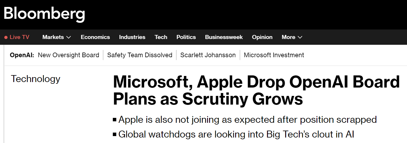 Microsoft and Apple decide not to join OpenAI's board of directors, as major AI tech companies are under tight scrutiny by global regulators.