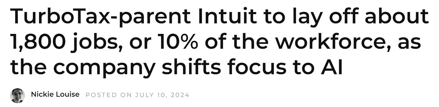 Intuit - TurboTax parent company laid off 1,800 workers (~10%) as the company shifts focus to AI.