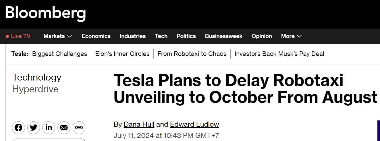 Tesla plans to delay Robotaxi launch to October to produce more vehicle prototypes.