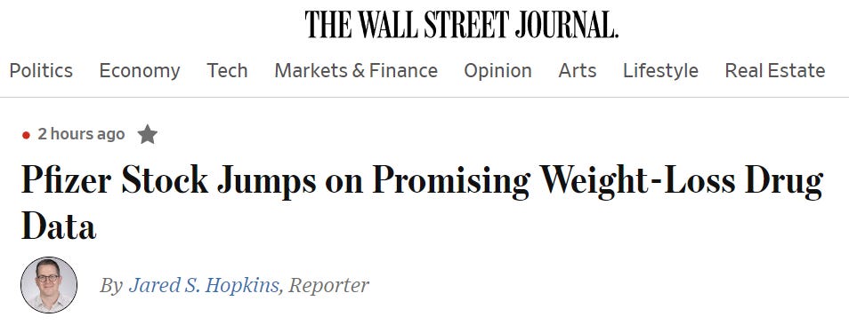 Pfizer stock rises after announcing human trials for daily oral weight-loss drug.