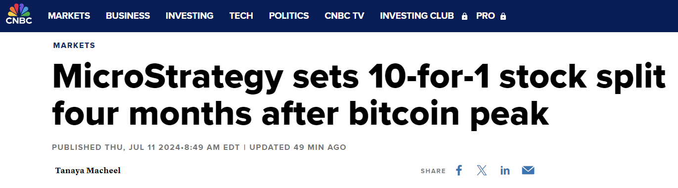 MicroStrategy announces 10-for-1 stock split, after Bitcoin price hit a high in March.