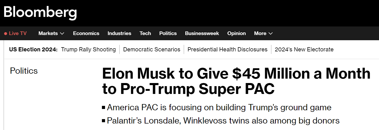 Elon Musk to donate 45 million USD/month to Super PAC supporting Trump.