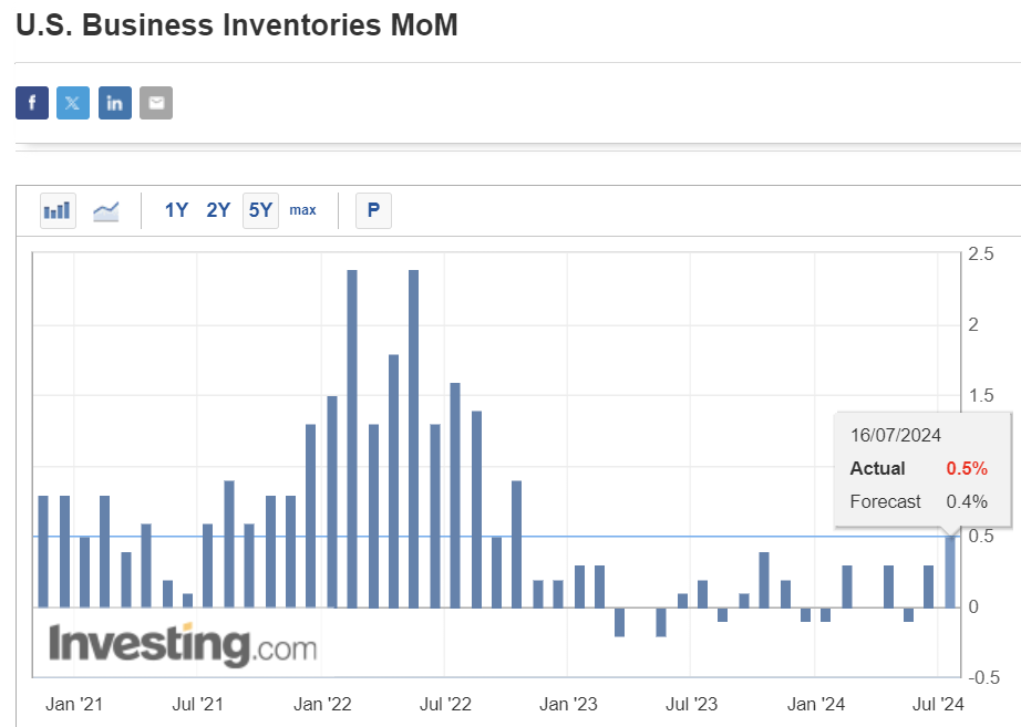 Business inventories for May increase +0.5% MoM, stronger than expected.