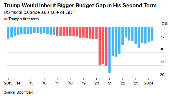 With the current budget deficit at -6.4% if Trump is re-elected, economic growth will need to be paired with government spending cuts plus debt restructuring so that economic growth can outpace public debt growth.